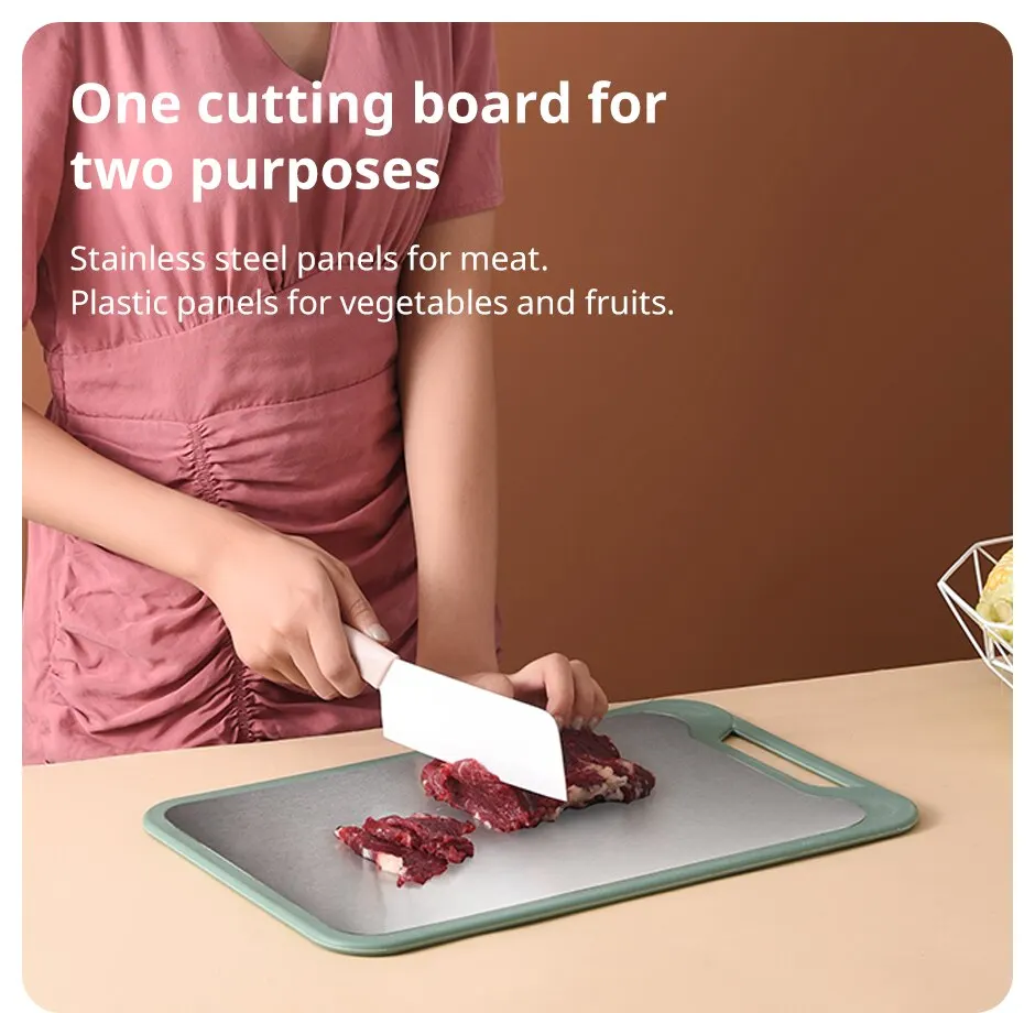 This cutting board is composed of two different materials, one side is made of PP plastic and the other side is made of stainless steel. You can cut vegetables and fruits on the plastic side; You can cut meat on the stainless steel side.